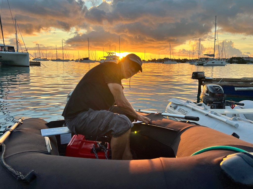 L’annexe est mise à l’eau à la poupe du voilier, et bientôt notre Miss descend l’échelle. Mais lorsque ses trois compères la rejoignent, force est de constater un léger problème dans l’équilibre du bateau, sans doute un manque de pression du pneumatique.